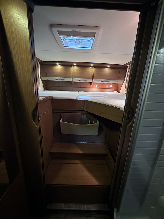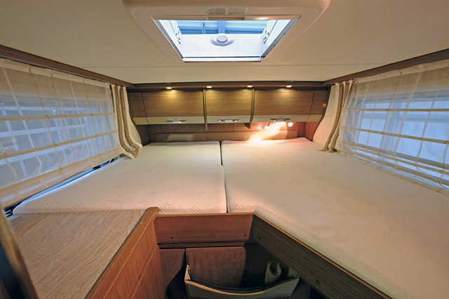 Medidas: Largo: 8755 mm, Ancho: 2300 mm, Alto: 2900 mm MMA: 5.000 kg Apertura Garaje: 115 x 100 cm, Interiores Garaje: Alto: 133 cm, Ancho: 133 (150) cm, Largo: 217 cm Cama techo: 140 cm x 200 cm, Cama atras: 200 cm x 215 cm